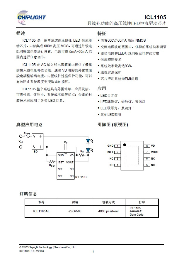 ICL1105 是一款單通道高壓線性 LED 恒流驅(qū)動(dòng)芯片,內(nèi)部集成 600V高壓 MOS.可通過外設(shè)電阻對(duì)輸出電流進(jìn)行設(shè)置,電流可在 5mA~60mA 范圍內(nèi)進(jìn)行任意調(diào)節(jié)。