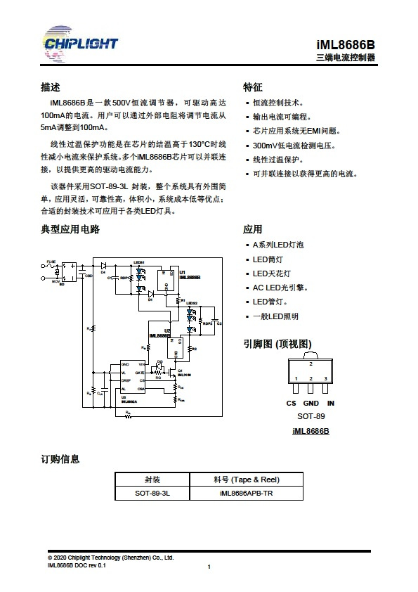 iML8686B是一款500V恒流調(diào)節(jié)器,可驅(qū)動高達100mA的電流。用戶可以通過外部電阻將調(diào)節(jié)電流從5mA調(diào)整到100mA。