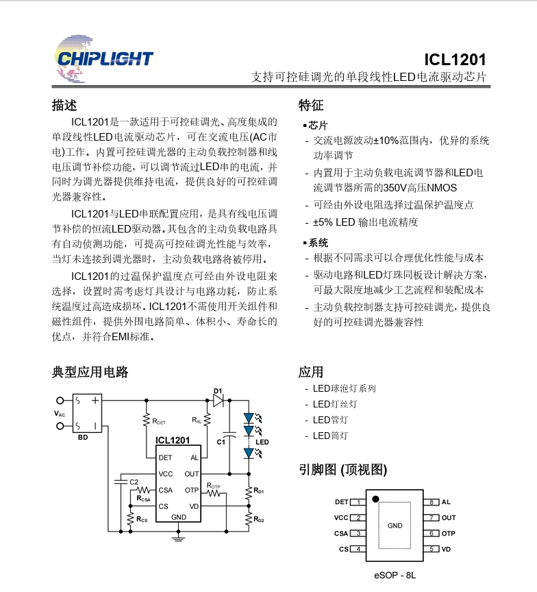 ICL1201是一款適用于可控硅調(diào)光、高度集成的單段線性LED電流驅(qū)動(dòng)芯片,可在交流電壓(AC市電)工作。內(nèi)置可控硅調(diào)光器的主動(dòng)負(fù)載控制器和線電壓調(diào)節(jié)補(bǔ)償功能,可以調(diào)節(jié)流過(guò)LED串的電流,并同時(shí)為調(diào)光器提供維持電流,提供良好的可控硅調(diào)光器兼容性。