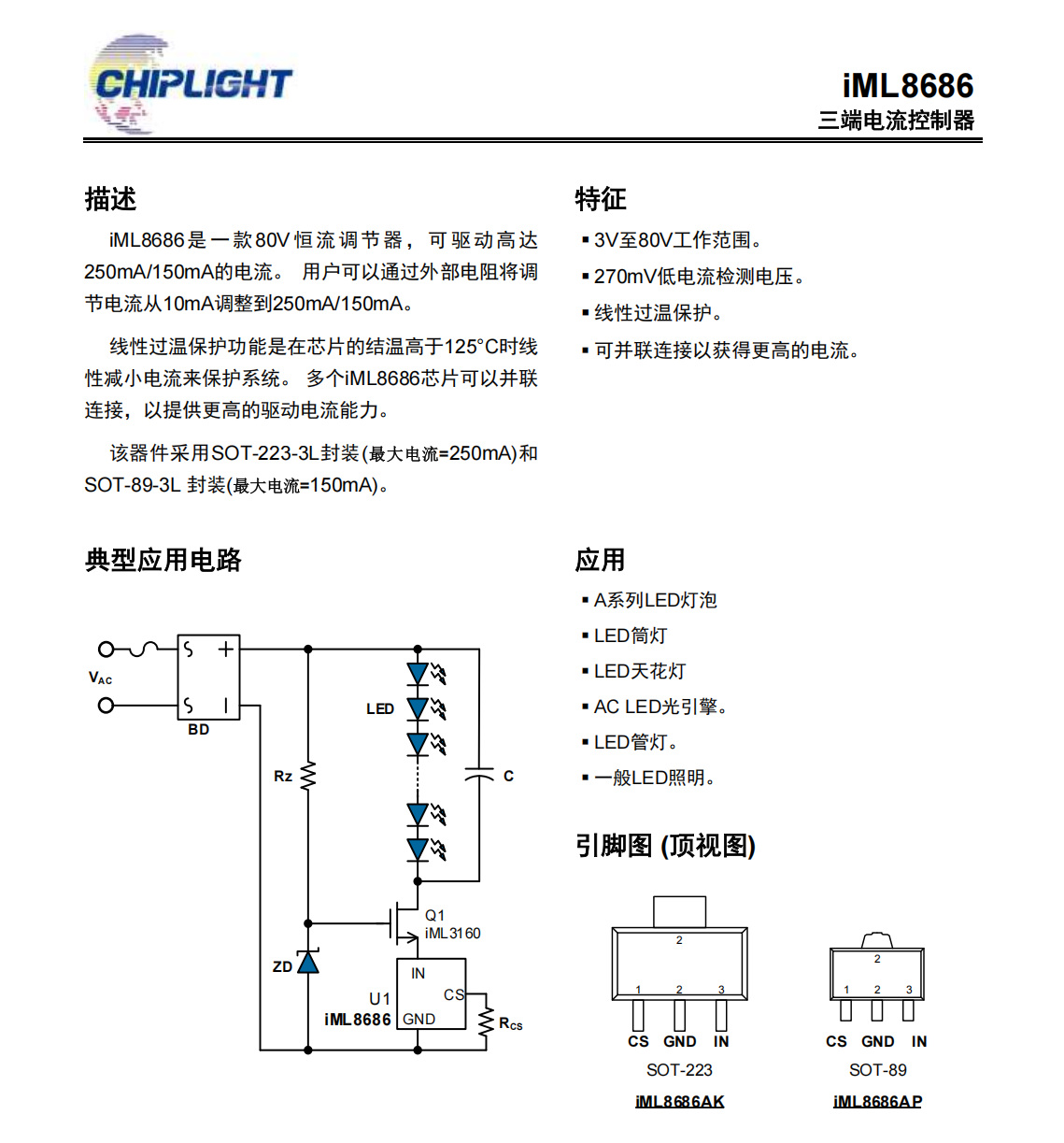 iML8686是一款80V恒流調(diào)節(jié)器,可驅(qū)動(dòng)高達(dá)用戶可以通過外部電阻將調(diào)250mA/150mA的電流。節(jié)電流從10mA調(diào)整到250mA/150mA。
